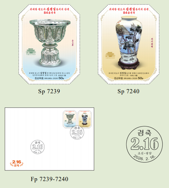 2026年2月16日发行《庆祝伟大领导者金正日同志华诞84周年》编号7239-7240